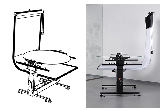 Both the C850 & C1300 have the same size body, with a strong steel frame weighing over 100 kg. This is heavier than the 70 kg aluminum design of the Case 850, but allows for greater stability and performance in the studio. Although it is at the cost of being slightly less portable, the sturdier design no longer requires a support bridge under the turntable. Thus, the design is more open, providing more angles for lighting objects.