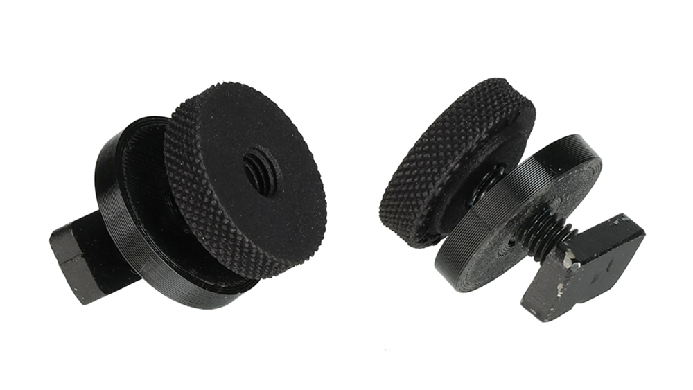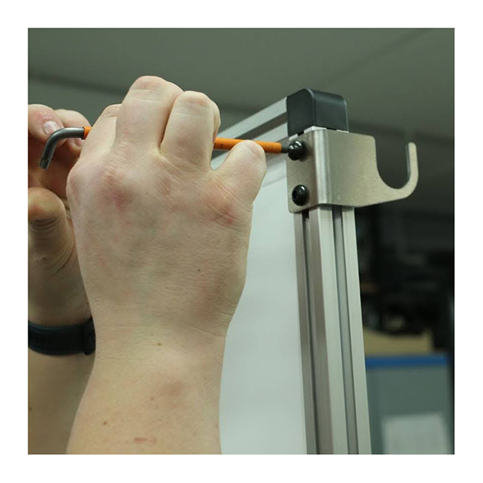 2.2.35. Find two black background holders and four screws, and mount them to the frame using the square nuts which were prepared in advance.