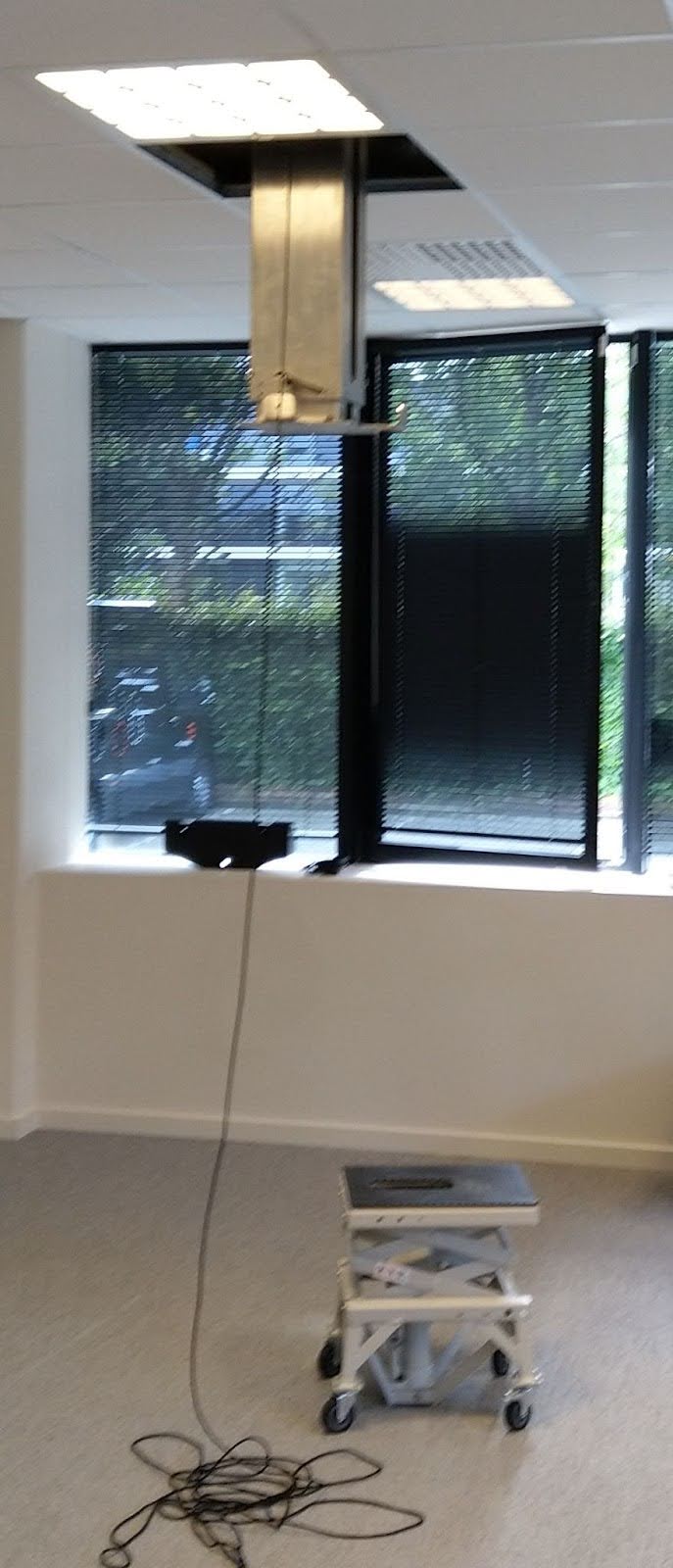 2.4.1. Some configurations will also include a telescopic pole for mounting an optional PhotoRobot Cube device to the ceiling above a C-Class module. In these cases, the telescopic pole is installed into the ceiling to hold the Cube above the C-Class robot. This allows for suspending items (or parts of items) above the turntable using the Cube with nylon strings to stage and rotate items for 360 photography. At the same time, the Cube is able to sync the rotation of suspended items to the rotation of the turntable, the movement of other robots, the studio lights, and camera capture.