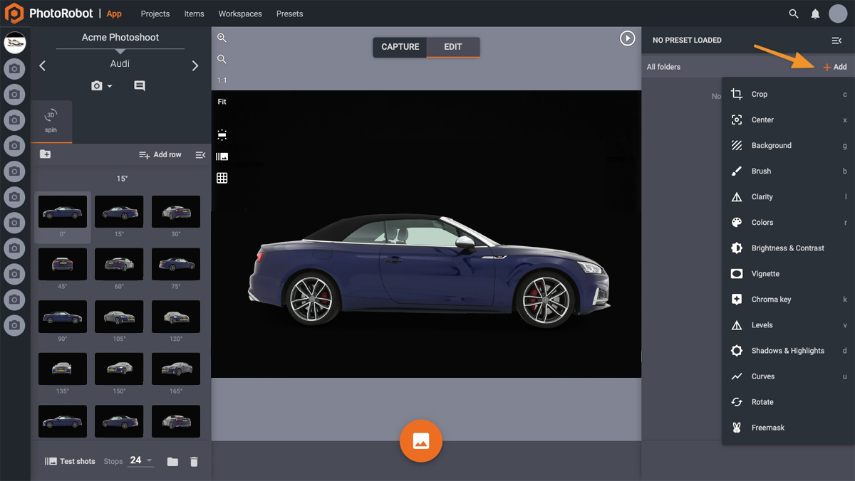 The PhotoRobot solution generates consistent, web-ready outputs on capture, with minimal or no need for manual retouching. Users can automatically apply a wide range of editing operations, and save parameters as Presets for future reuse. We like to say our software allows users to “Set once and forget.”