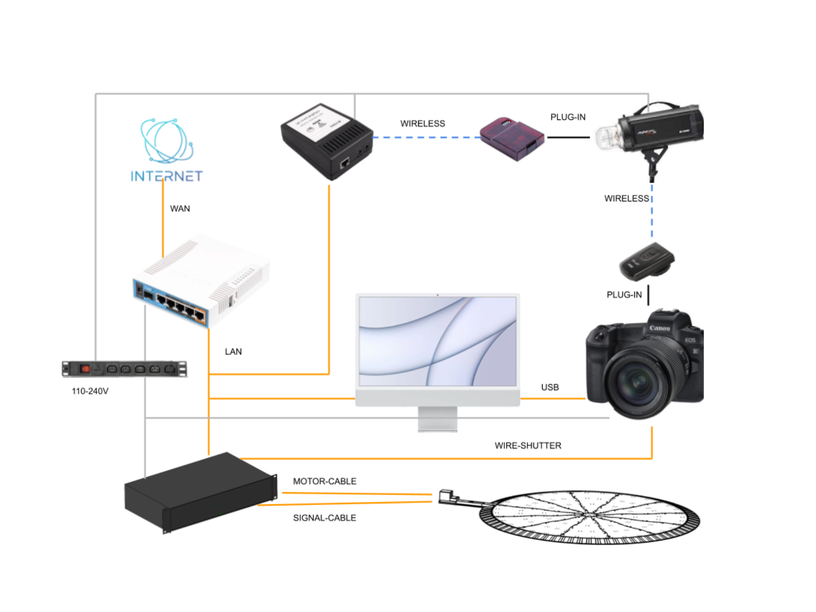The Carousel connects to the workstation computer over a router on the local network (LAN or WAN), with a 110-240V electrical connection for all devices. A motor-cable and signal-cable connect the rotating platform to the Control Unit and engine, while the camera connects to the workstation computer via USB. Studio light connection is using a plug-in adaptor for wireless connectivity to the router.