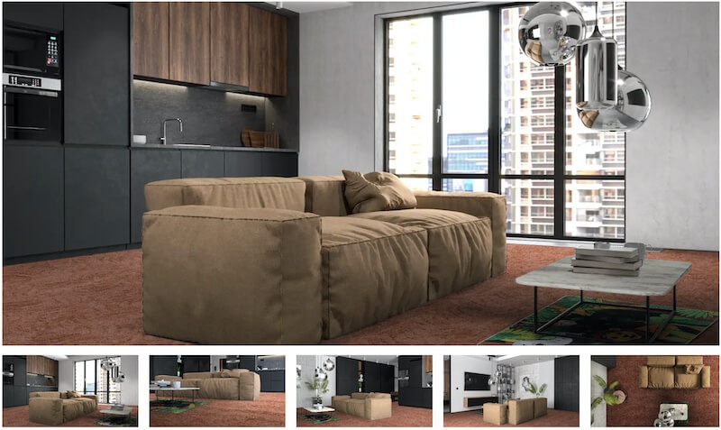 Developed with Jakub Klaus of Breno Carpets, the Carpet & Flooring Visualizer is a custom PhotoRobot Product Viewer solution. It enables the digital presentation of carpets and rugs in a virtual space. Viewers can swap between different designs & colors, and position products around the room on different places of the floor. There is thumbnail navigation to change the interior view, with buttons to switch between products or load a 360 spin. The viewer also enables the configuration of the flooring allowing consumers to mix and match items with different interior designs.