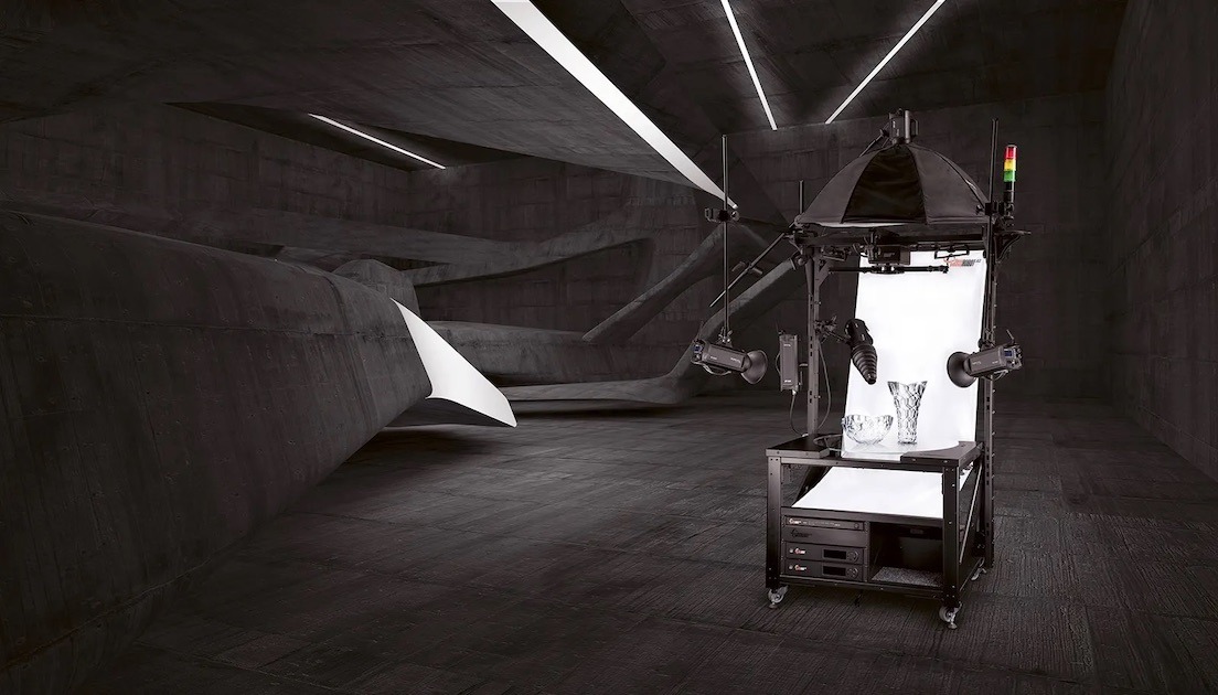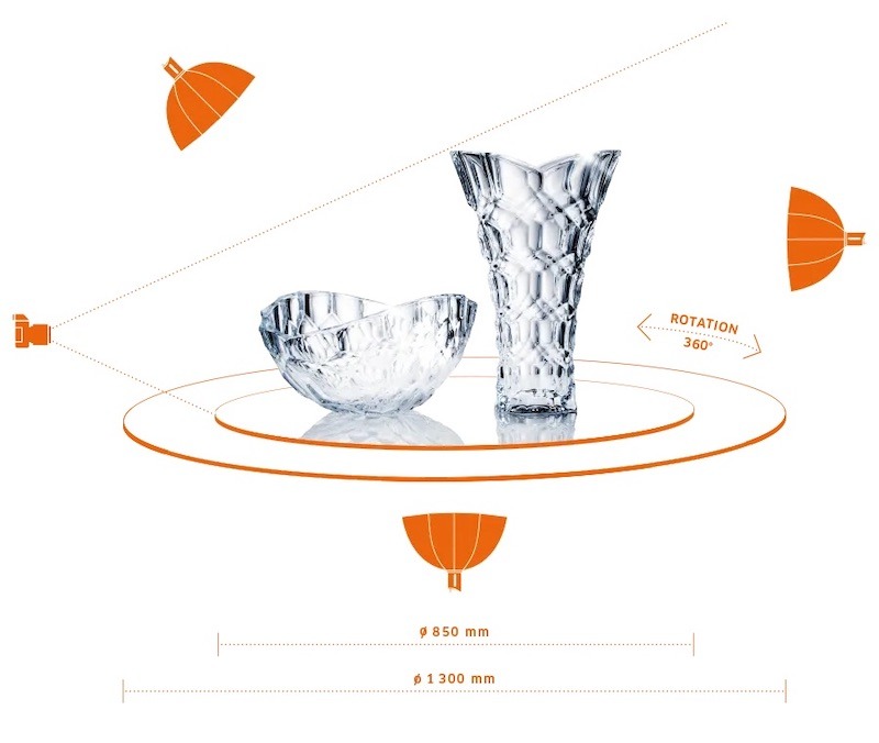 The Centerless Table is a universal photography turntable solution for shadow-free product photography of small to medium size products. It aims to accelerate, streamline, and simplify photography of objects with any photographic properties: transparent, glossy, light, and dark products. The turning glass plate is able to stage objects the size of an earring up to luggage, while a diffuse background enables lighting objects from all sides during photography. This naturally creates high-quality photos on a pure white background. It also supports the quicker, automated post-processing and publishing of images.