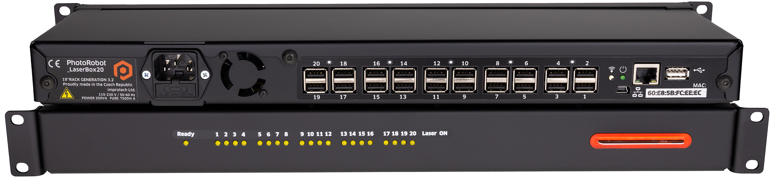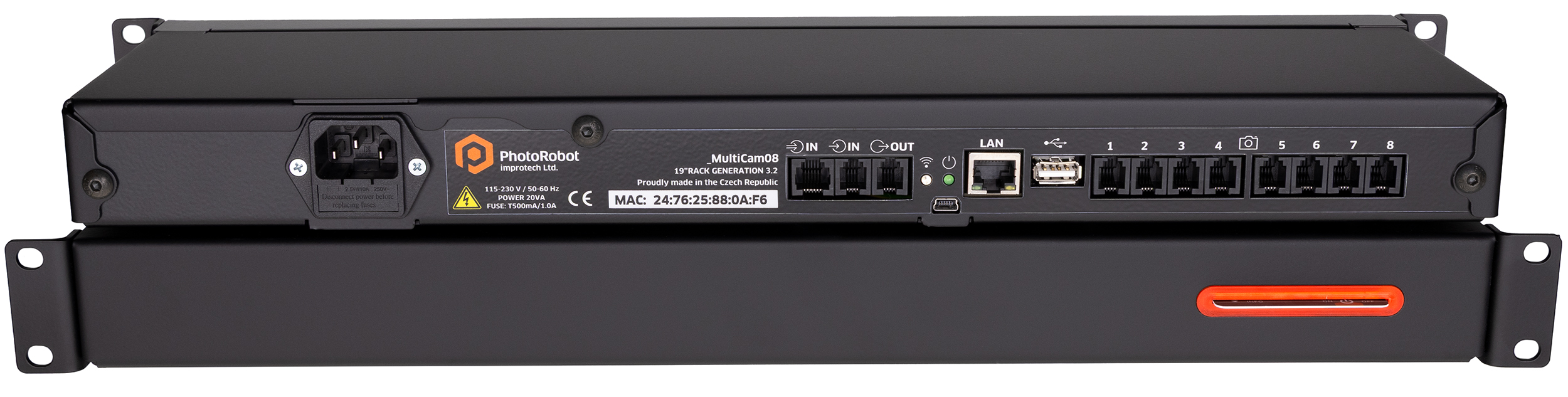 PhotoRobot control units are interconnected exclusively via a LAN network (USB and similar solutions cannot be reliably used on a larger scale, while LAN-based solutions can cover the needs of a small studio with one robot, same as large companies running more than 200 robotic workspaces in one cluster). A built-in web server (operating on the unit’s IP address) provides access to the unit’s control system (updates, service, monitoring). The unit can also be located and managed using the PhotoRobot Locator web application on the App Store and Google Play.