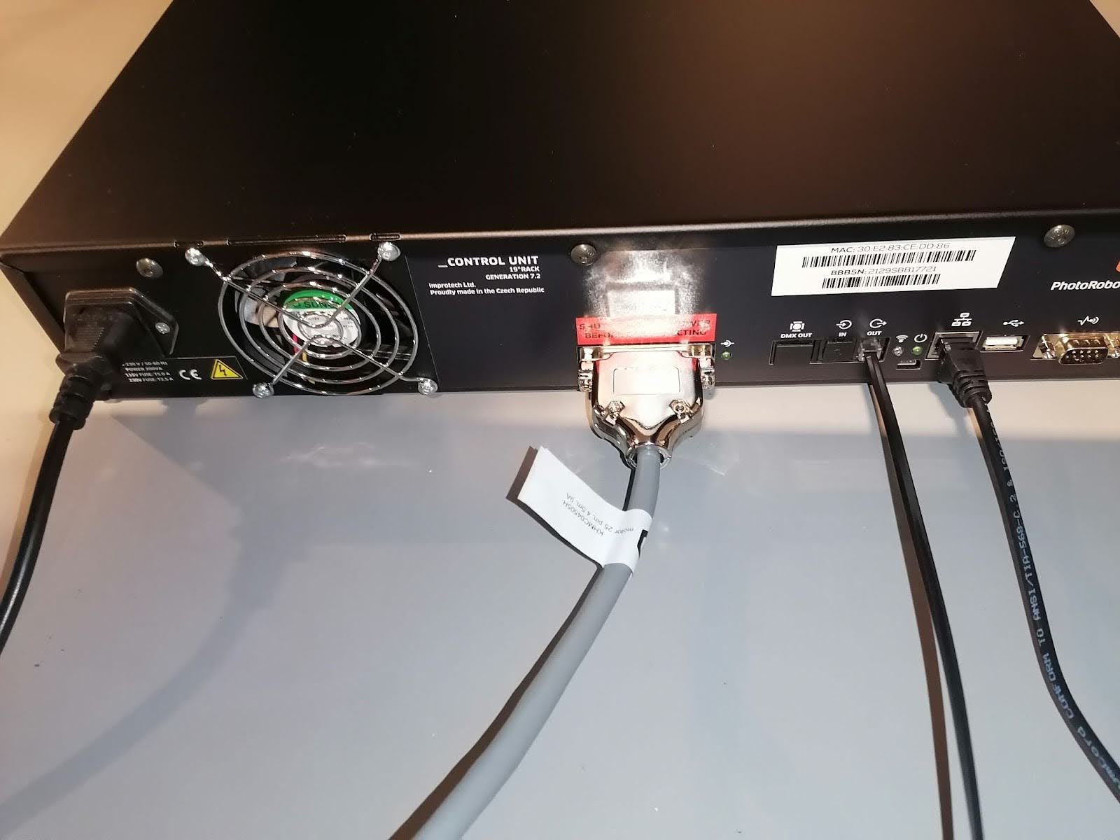 Note: For the Cube V5 / V6 models, the Control Unit is a separate device. Find the RJ45 connector on the back of the Control Unit. The Cube Compact has the Control Unit integrated into the machine. Find the RJ45 connector on the back of the Cube robot.