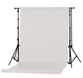 3.3.2. Place the paper background with the stud set onto the fixing forks of the two tripods. One will hold the left side of the background, and the other will hold the right side of the background.