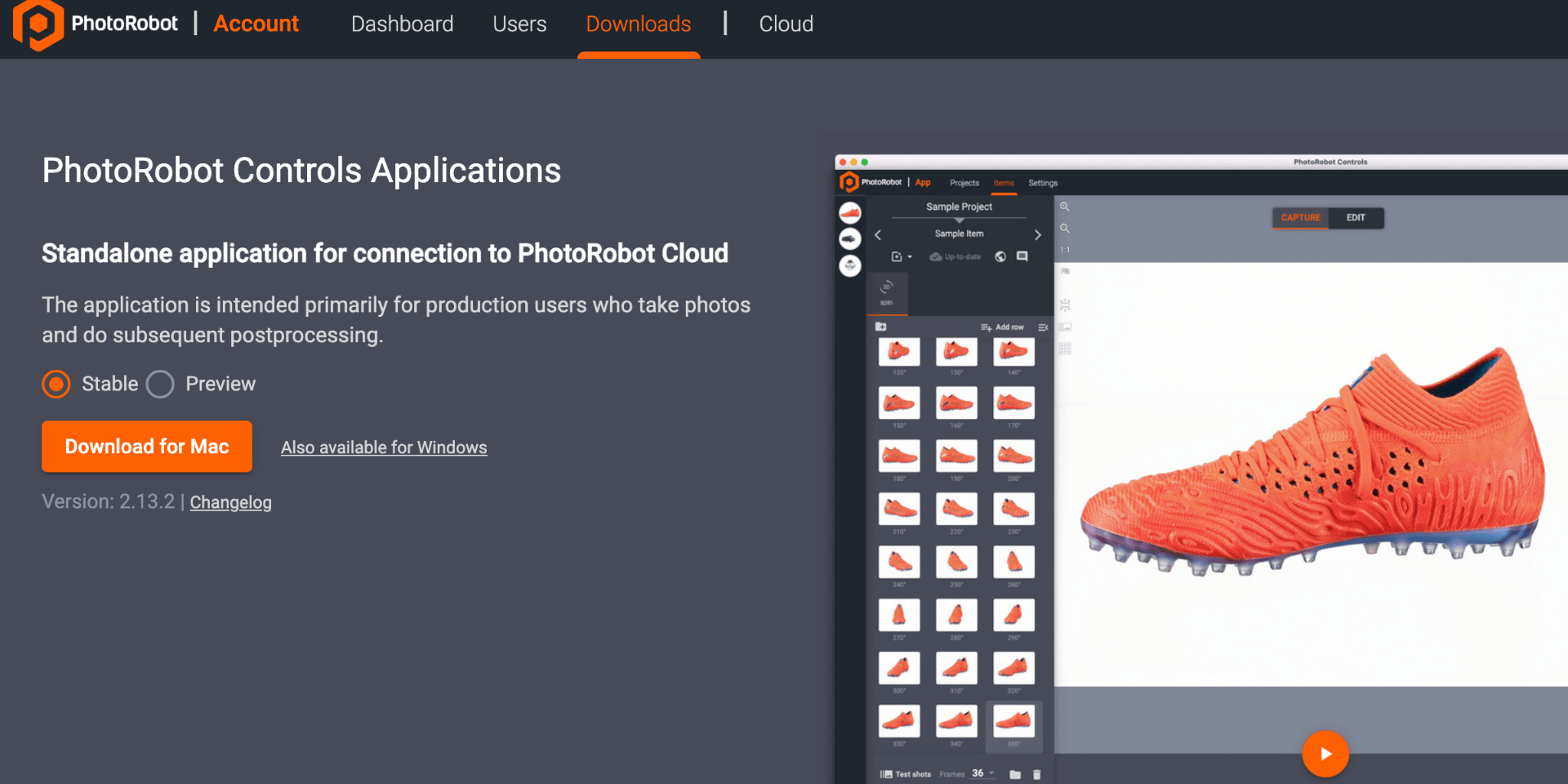If external download of the app is required by the customer, PhotoRobot Locator is also available for iOS download within PhotoRobot Account Downloads.