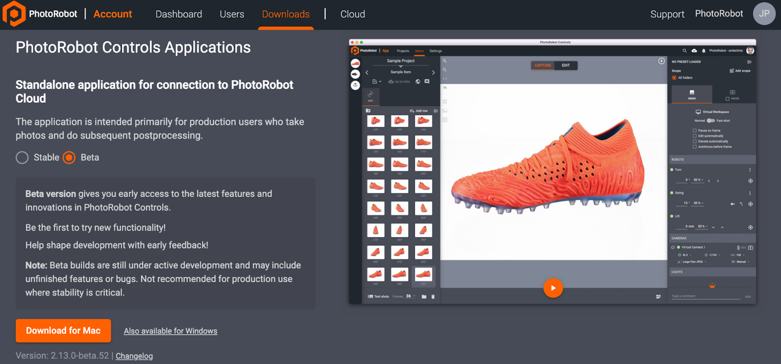 PhotoRobot _Controls App software is available for download via your PhotoRobot Account. It is not included with the machine delivery. PhotoRobot _Controls App software is purchased separately from the machine.