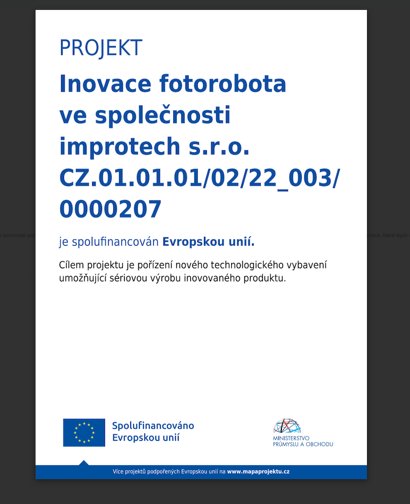 Innovation of PhotoRobot in society via the company improtech s.r.o. (CZ.01.01.01/02/22_003/0000207) is co-financed by the European Union.