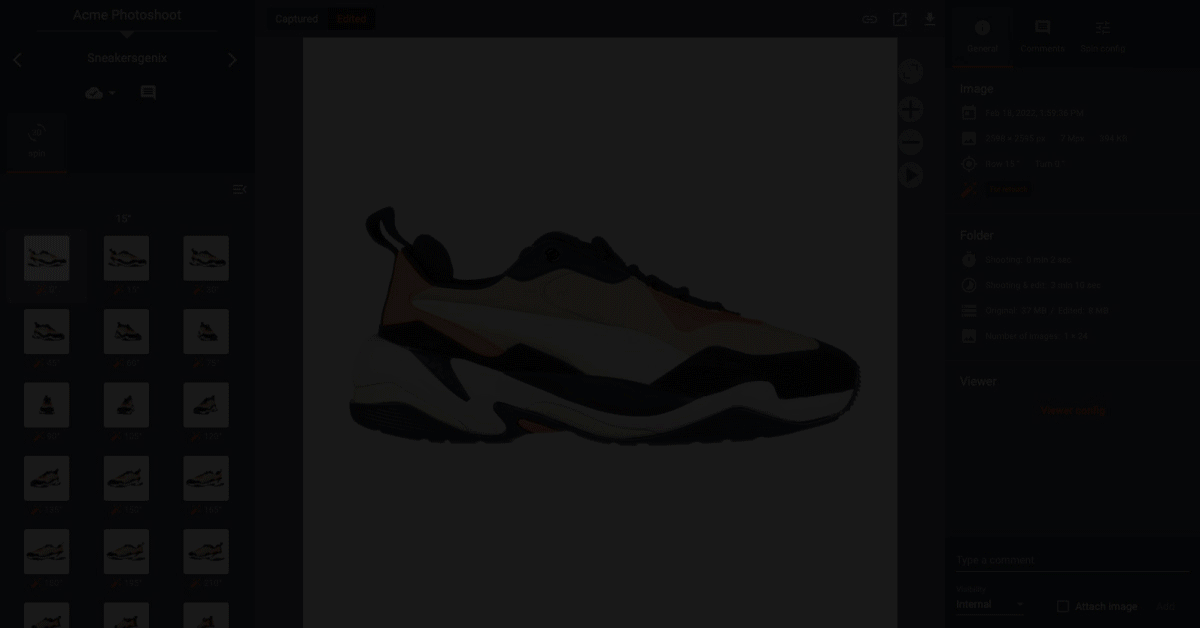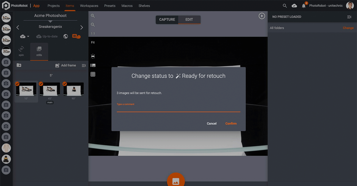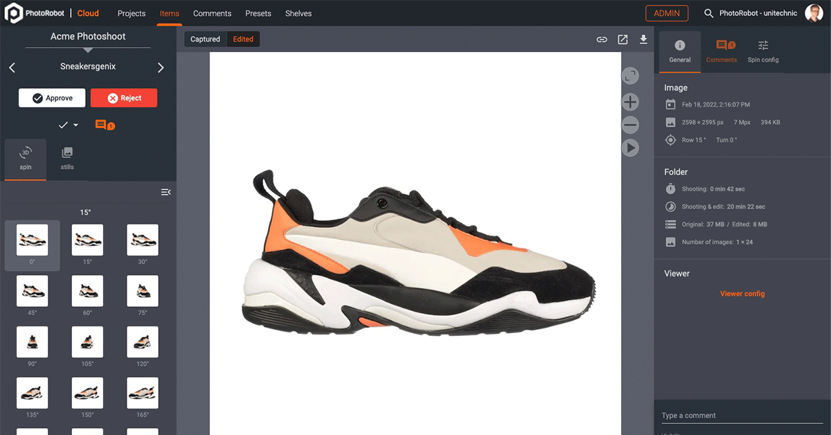 PhotoRobot Control software paves the way for complete automation of 360 product photography and digital asset management. Command robots, high-end Canon DSLR and mirrorless camera models, lights, post production, publishing, review processes and more. All from a single interface, with configurable presets you set once and use for the long-term.