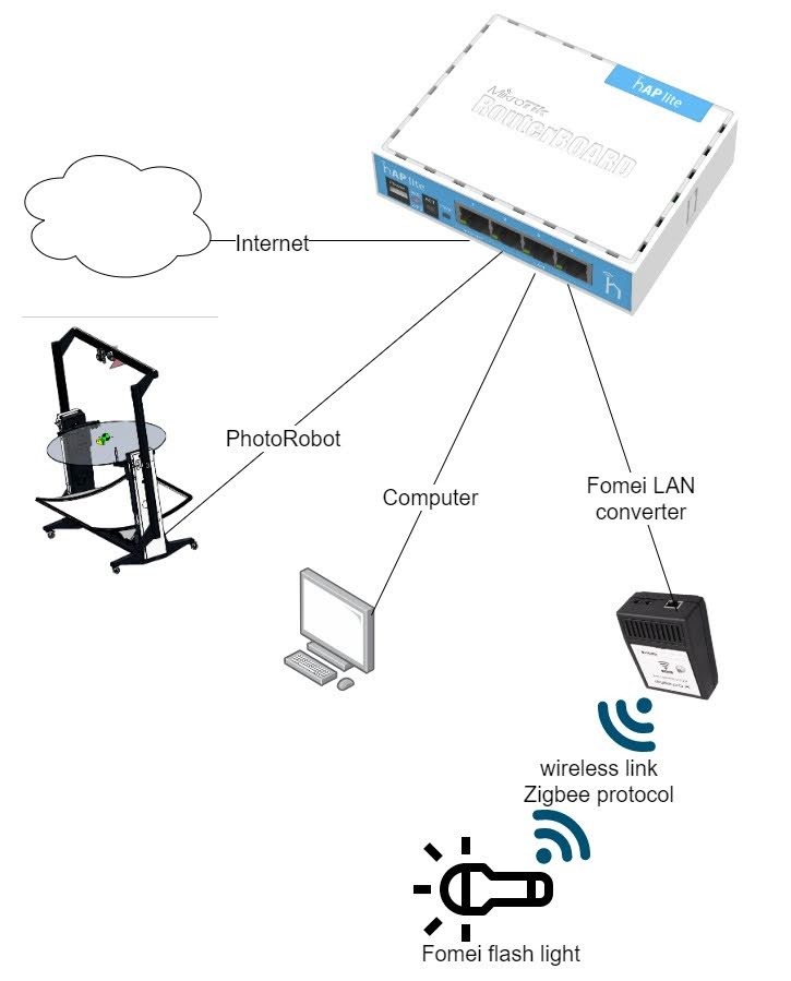 The following displays the connection scheme for Fomei flash lights. Note: The router type can vary if the rack case is delivered with the PhotoRobot solution.