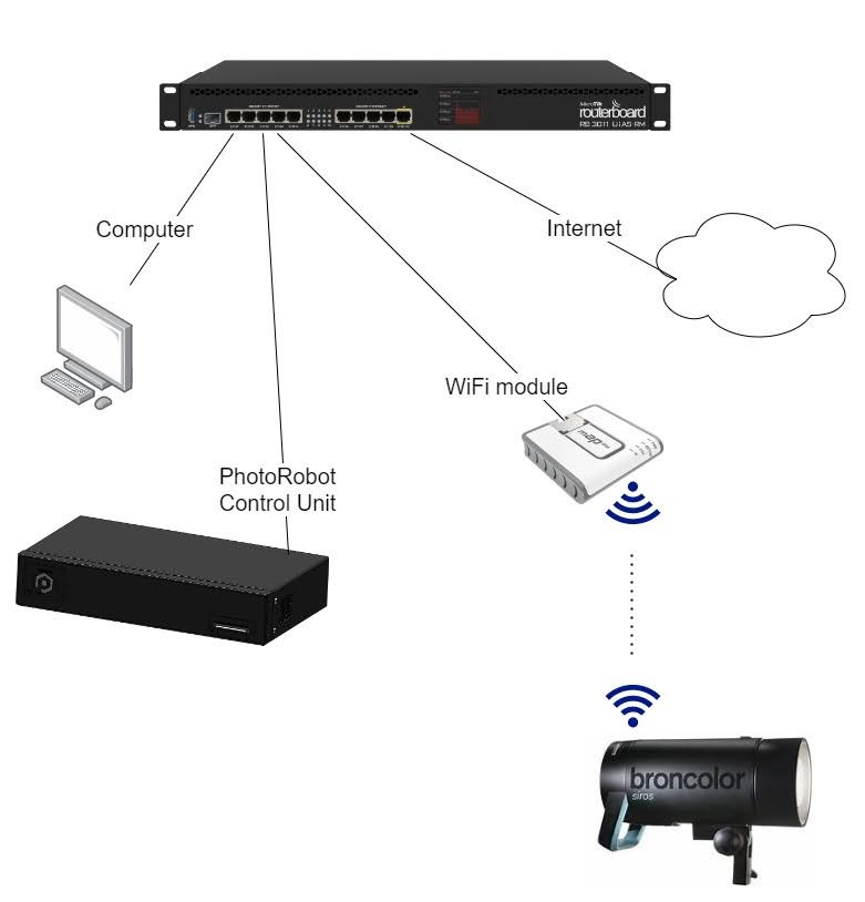Use the following map on the connection scheme for Broncolor flashlights, keeping in mind that the router type can vary. Note: Refer to PhotoRobot - Broncolor Lights Management for details on related hardware and software components necessary for use with PhotoRobot.
