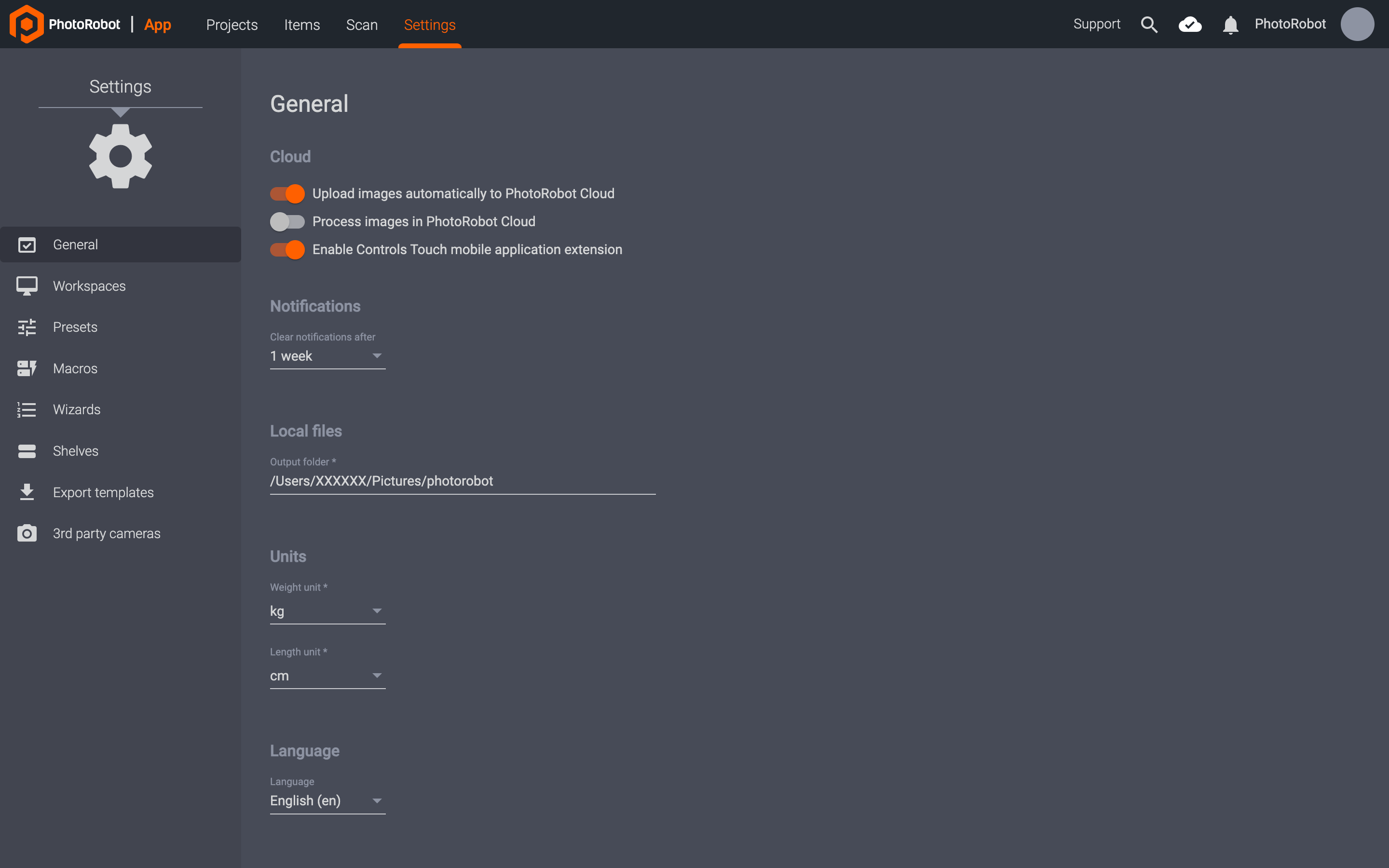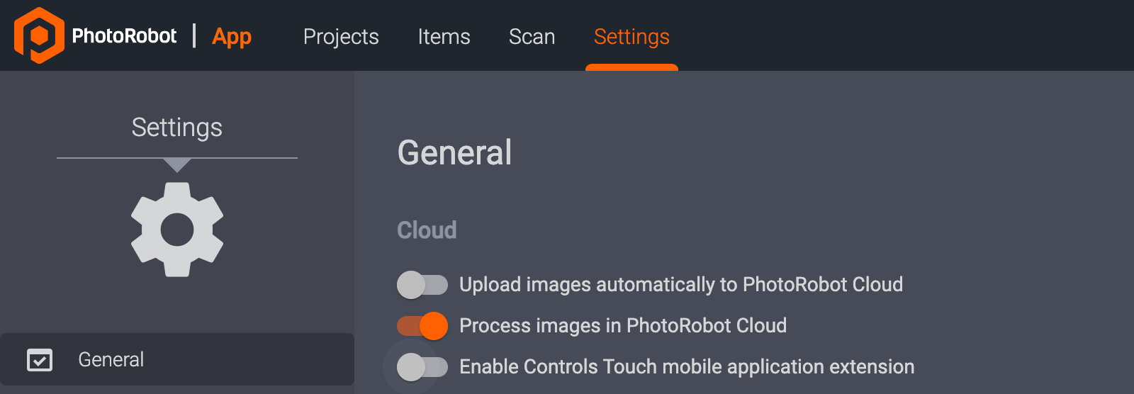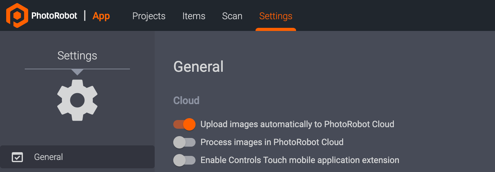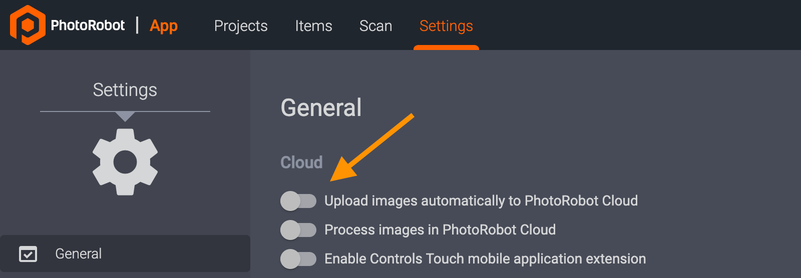 To disable Upload images automatically to PhotoRobot Cloud, toggle the option off in the local version of CAPP’s General Settings. This will instead save captured items to your local app or to your own cloud account.