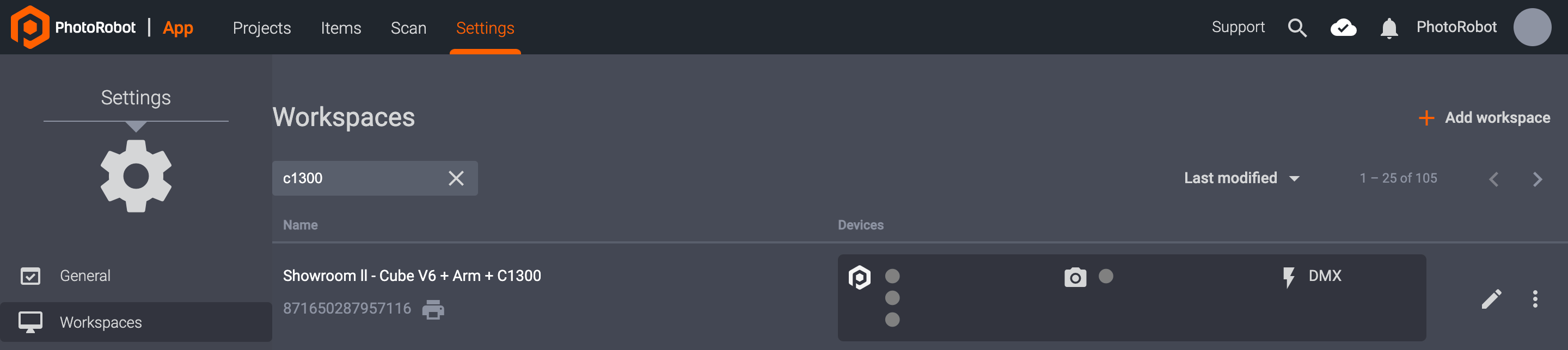 After opening CAPP, typically the first thing a user does is create a workspace. A workspace is a list of hardware that is being used for a particular photoshoot. It can include various PhotoRobot modules, cameras, lights, and other accessories.
