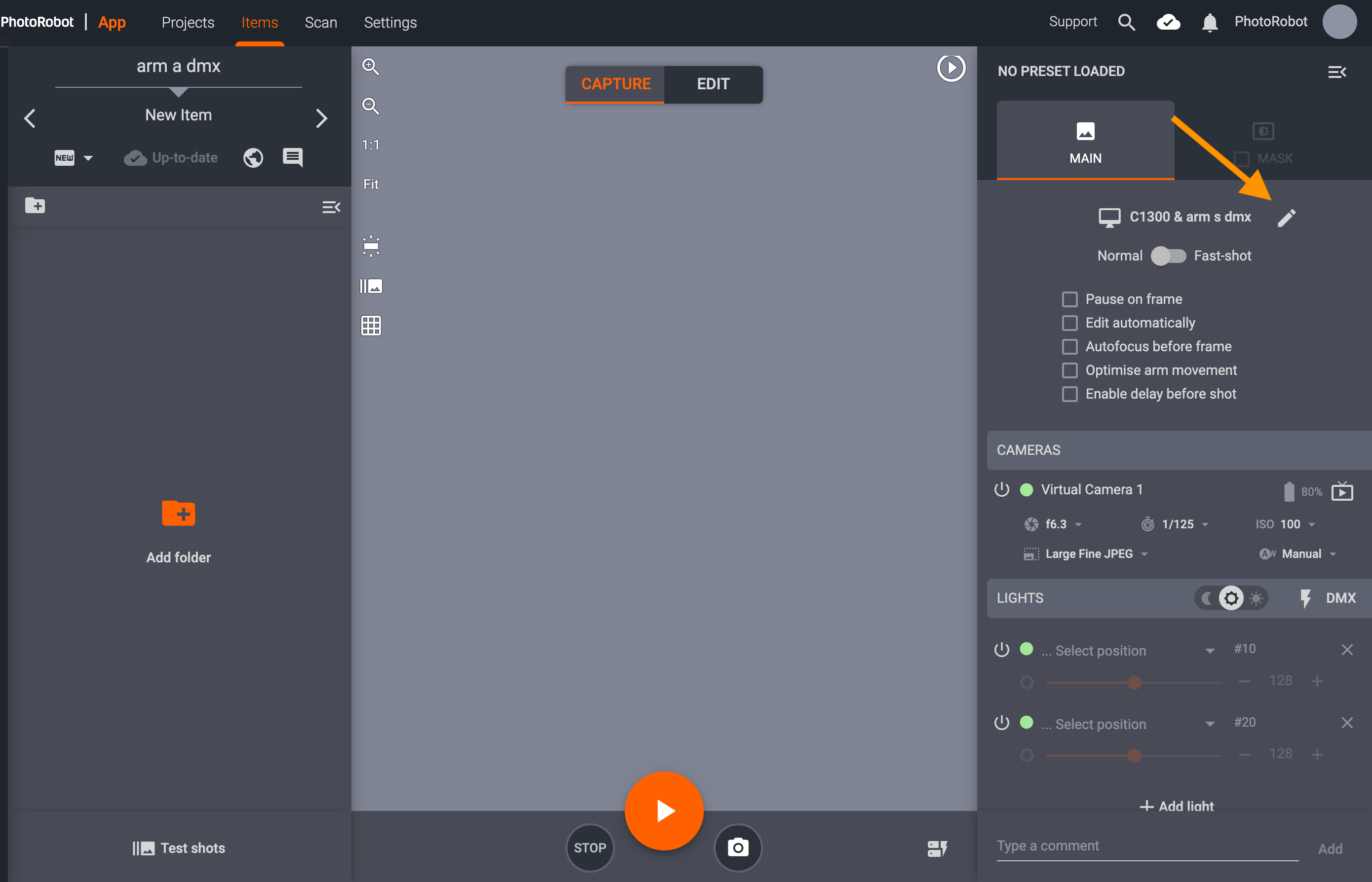 If using a Robot Arm in the workspace, note that there will likely be additional setup required. This is because the robotic arm is an independent machine, and one of the functions of controlling it via CAPP is that the elevation movement aligns the rotation axis to the midpoint of the photographed object’s height.
