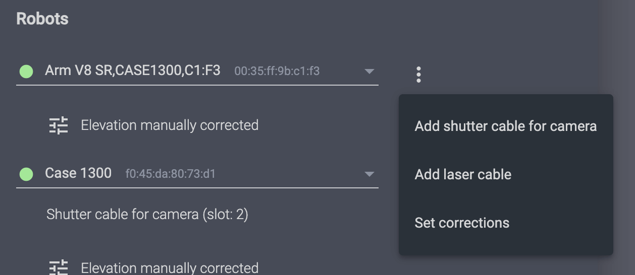 Either method will open the Edit workspace settings. Then, to configure the Robot Arm, find the device under the Robots menu, and click the 3 vertical dots next to the Robot Arm name.