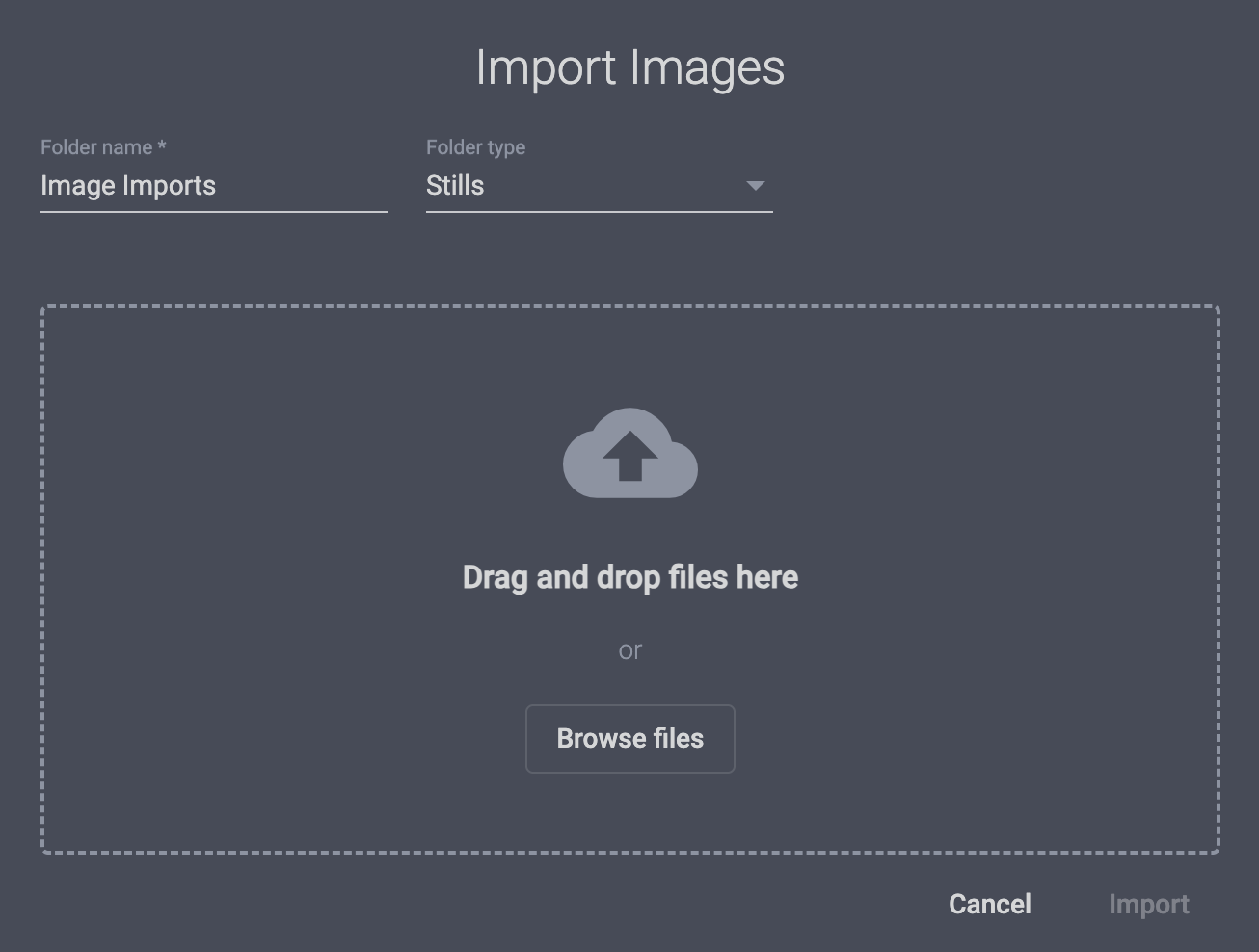 Clicking Import images will open a pop-up window that enables image import by drag-and-drop, or by browsing local files. At the top of the window, it is also possible to configure Folder name and Folder type for the imported images.