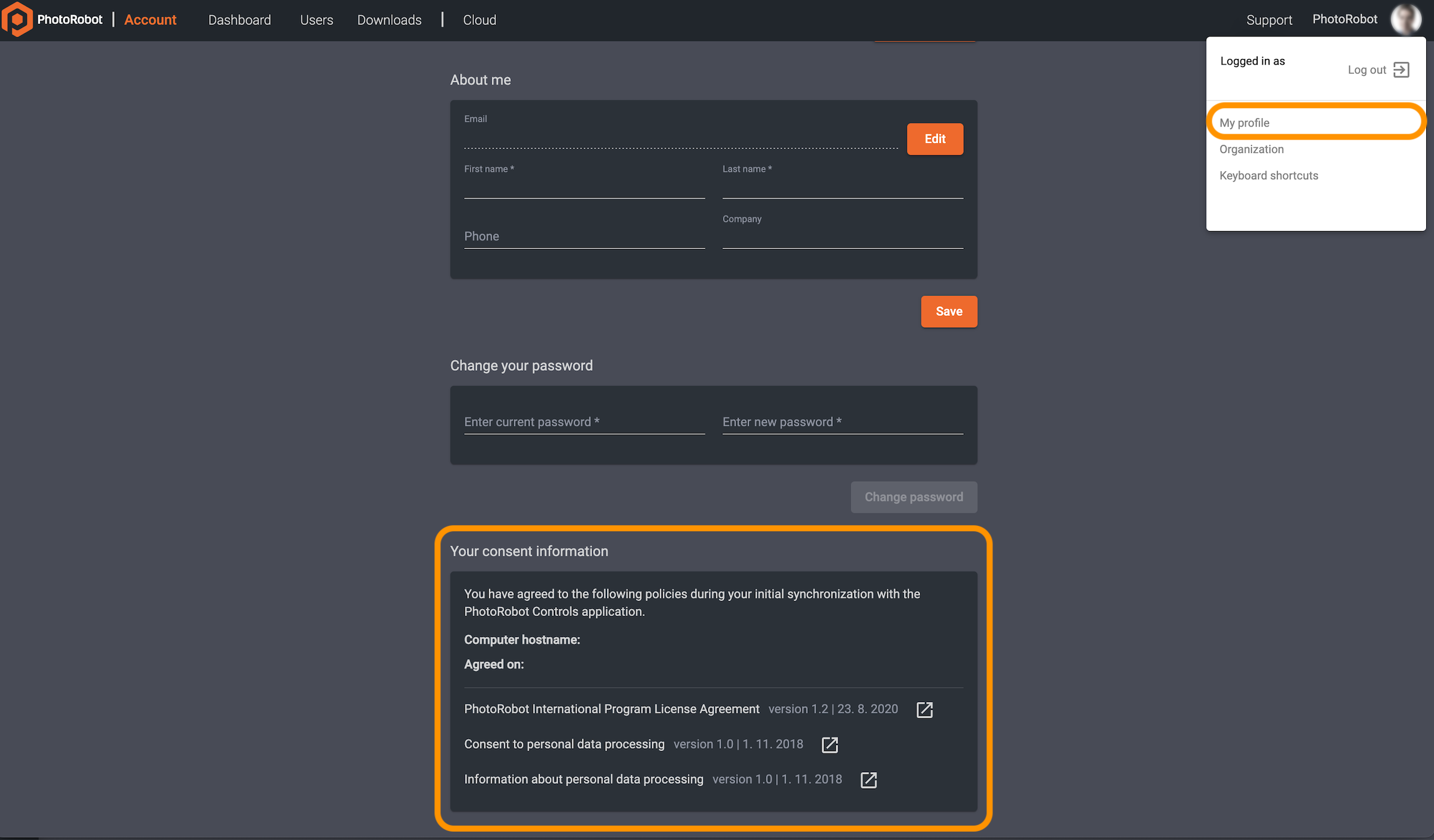 The profile menu will display the profile photo, general user information (name, phone, company), password settings, and the consent information. Consent information includes: