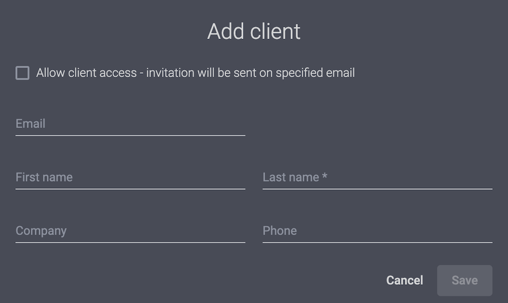 5. Complete the fields for the client’s information (email, name, company, phone), and check the box Allow client access. Review the information for accuracy, and click Save to add the client to CAPP.