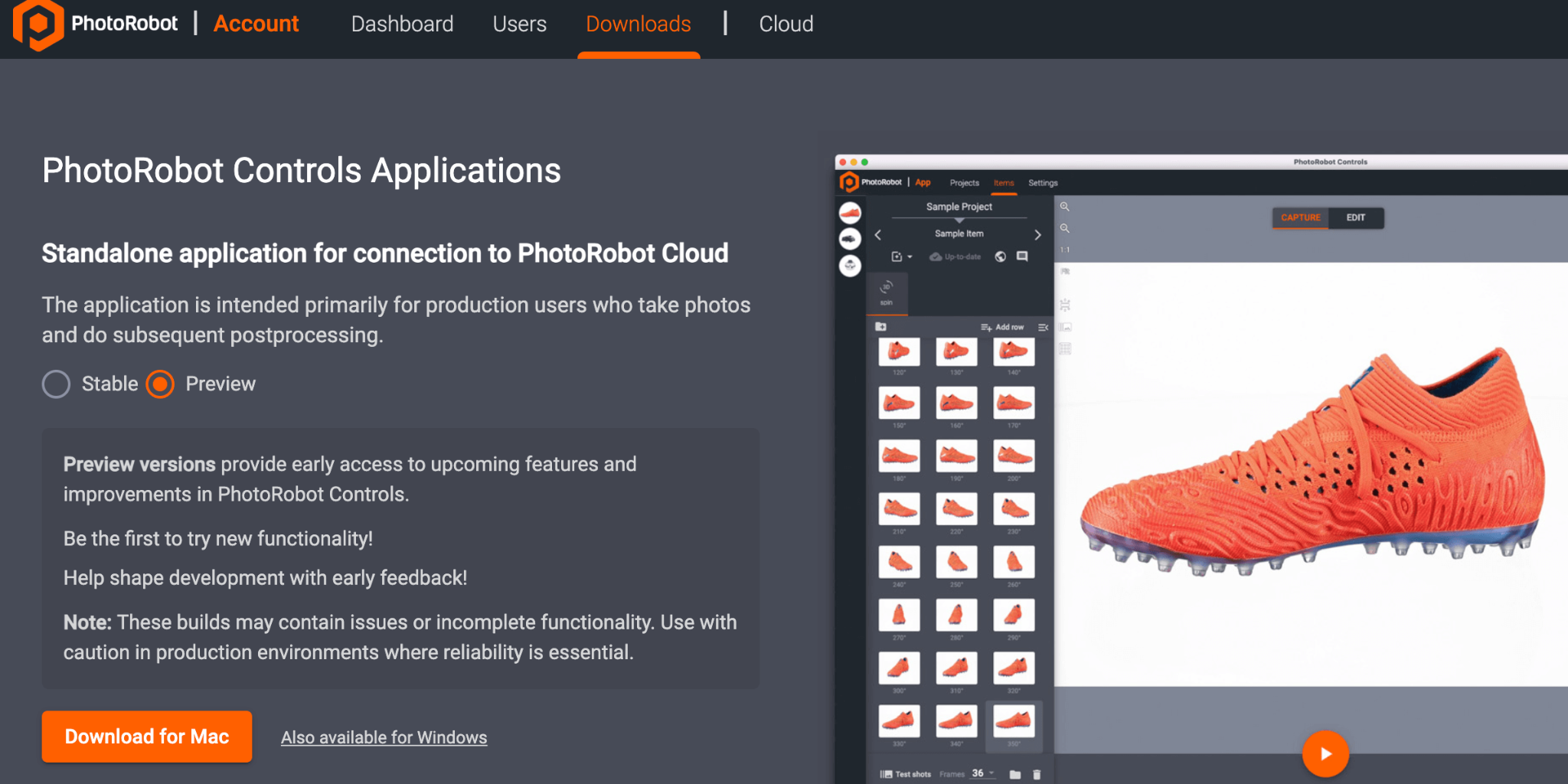 To install PhotoRobot Controls App on your computer, log in to your PhotoRobot Account and go to PhotoRobot Downloads.