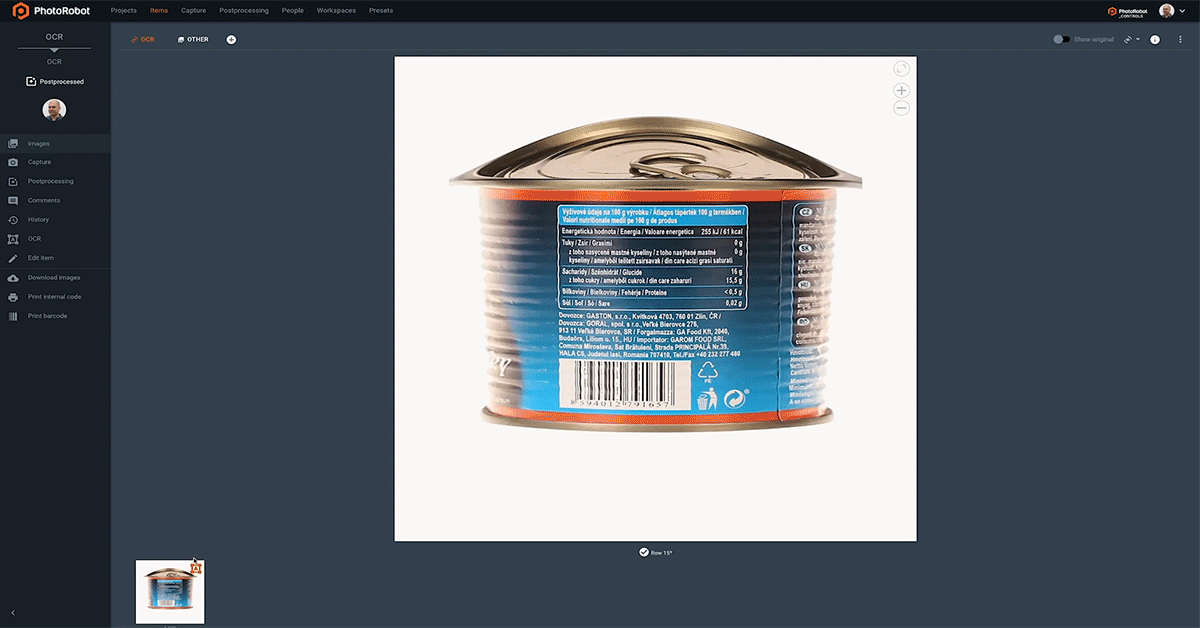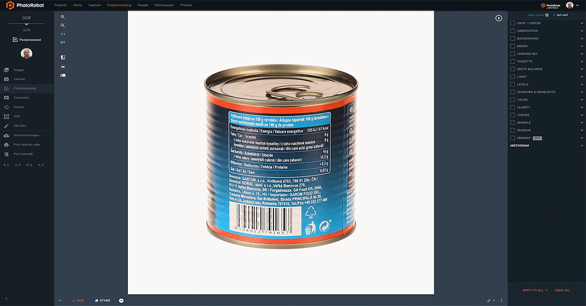 Certain grocery product photography can provide challenges. This is particularly true when photographing rounded, packaged products with labels. Often, these are products that come in cans or jars, with text wrapping around the areas you need to photograph. Thankfully, PhotoRobot can photograph groceries and other packaged products with labels extremely quick and easy. PhotoRobot can even read text on the packaging, flatten it out into straight lines, and allow you to pick and choose which text to showcase.