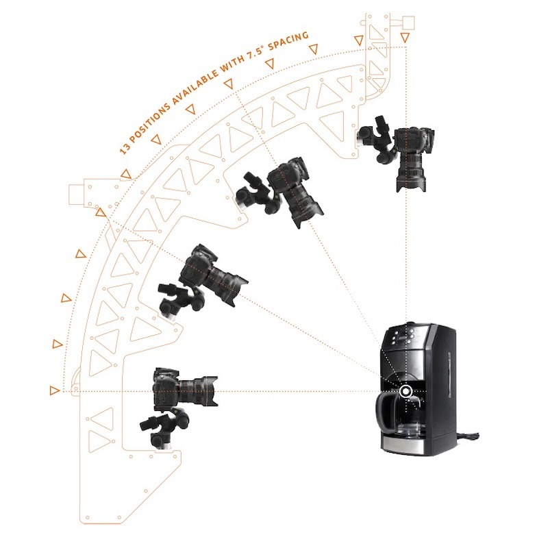 The MultiCam is available in two models: the MultiCam Pro, and the larger MultiCam Pro XL. The only difference is the size of the camera arch, with the XL functioning as the larger of the two models. Both the MultiCam Pro and Pro XL are compatible with all PhotoRobot robotic turntables. The device enables the capture of 144+ images from multiple cameras in approximately 20 seconds. This includes the simultaneous capture of marketing angles and top views in a 360-degree rotational range. Meanwhile, the extremely precise camera control and image capture with 13 available camera positions supports rapid multi-row photography. The precision of the robotized capture enables the automated post-processing of individual images for 3D spin and 3D model generation.