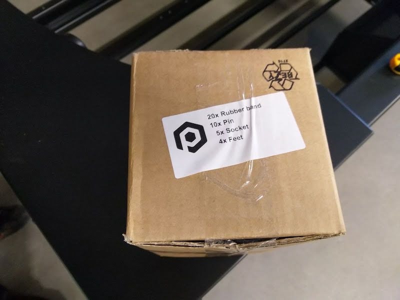 2.1.2. Locate the labeled cardboard box with 20 x rubber bands, 10 x pins, 5 x socket, and 4 x feet.