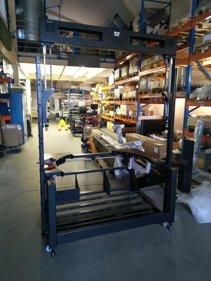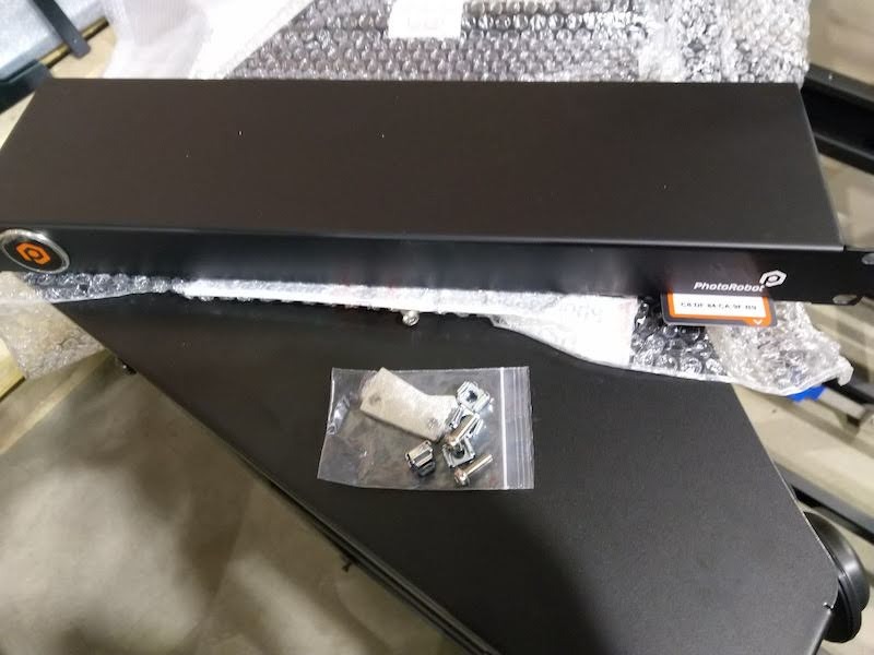 When assembly of the MultiCam bow is complete, locate the PhotoRobot SynchroBox and a blinder rack for installation. The PhotoRobot SynchroBox is a multi-camera hub which synchronizes the camera shutter of two or more cameras. Install the SynchroBox and the narrow blinder rack in the MultiCam portal.