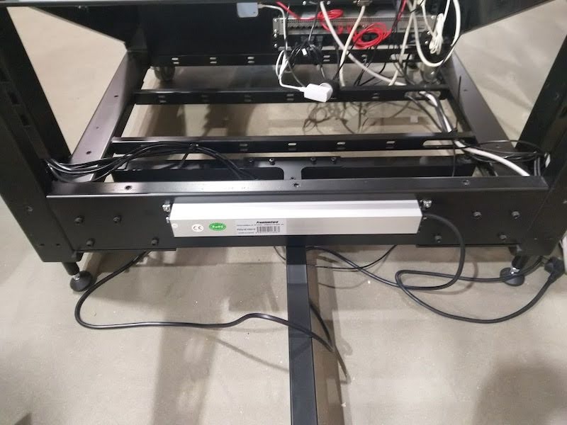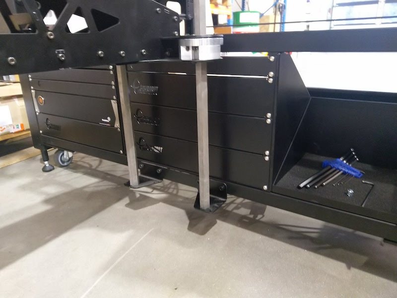 On the front side of the Centerless Table, there is an HD rack with shelves in the bottom-left half of the machine frame. The HD rack houses the LaserBox, the SwitchBox, and the Control Unit.