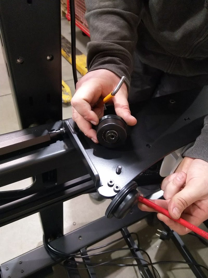 7.1. Next, prepare to install the plate of the Centerless Table by loosening and removing one back wheel, using the following photos for guidance.