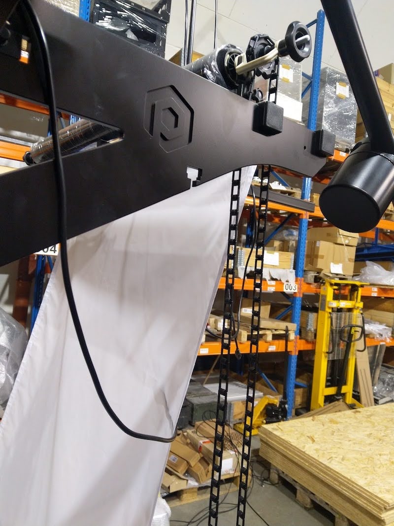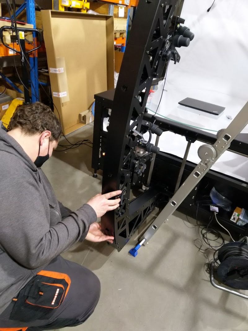 2.4.10. After securing the front part of the bow to the portal, fasten the PhotoRobot logo tightly onto the MultiCam bow.