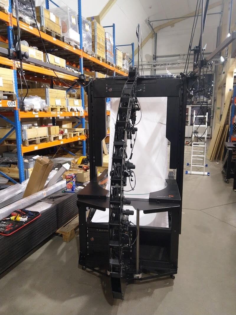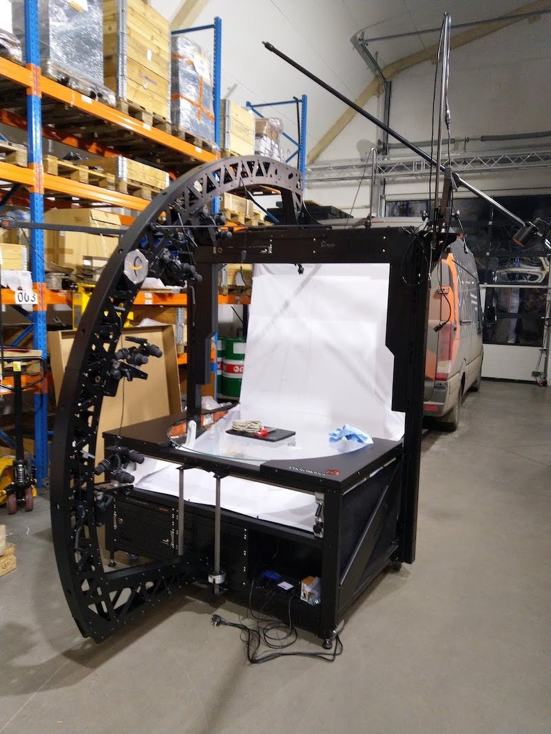 The MultiCam functions in combination with the Centerless Table (CL1300 / CL850) as a universal photography turntable and multi-camera rig solution for robotized 3D photography. Together, the two devices enable shadow-free automated photography of small to medium size products. This includes objects of varying photographic properties: transparent, glossy, light, and dark products. At the same time, the turning glass plate holds objects from the size of an earring to luggage, with a diffuse background that enables even lighting of objects from all sides during photography. Thus, each camera shooting from the MultiCam can automatically create high-quality photos on a pure white background, including marketing angles and top views simultaneously. At the same time, this ensures quick and highly efficient automation in the post-processing and publishing of images.
