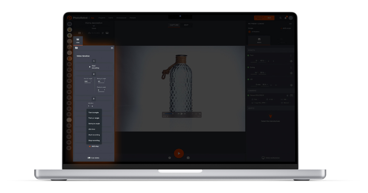 Deploy Timeline automation to create for example the flying camera effect. This visual effect makes the camera hover around and above a product rotating 360-degrees. Program each movement for the effect on the timeline, and take complete control over product videos with robotic precision. Then, save settings to reuse again and again as configurable “Presets”.